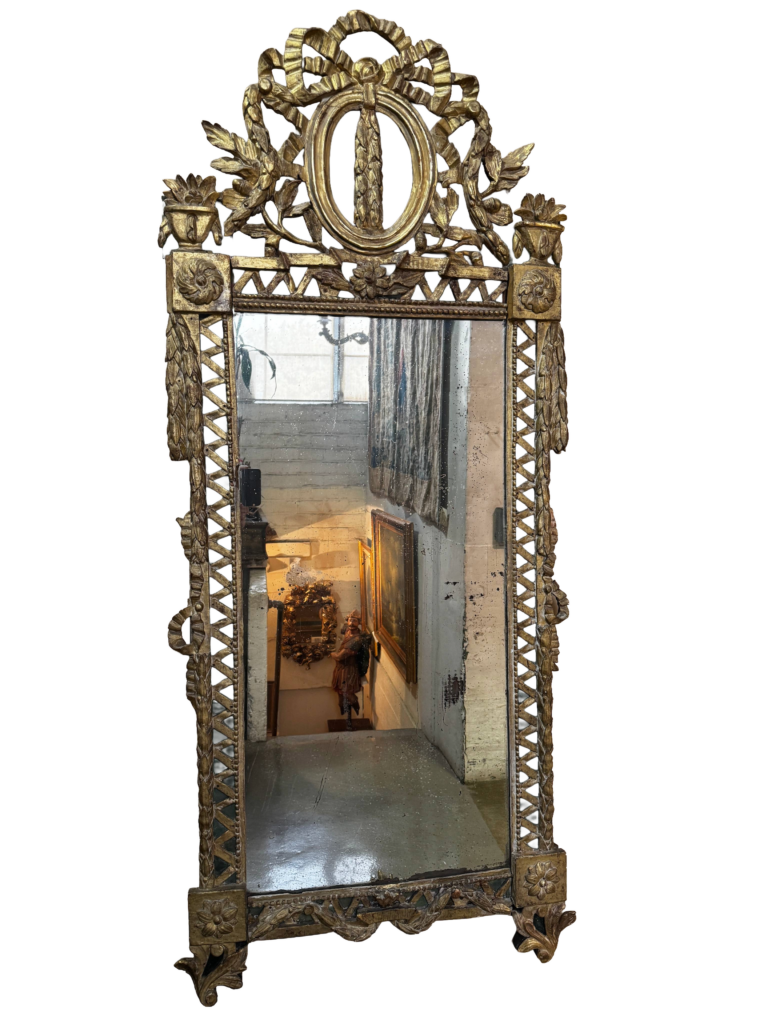 An Italian carved giltwood Framed Mirror, circa 1780. Rectangular plate mirror framed with lattice work green and gilt border. The frame is surmounted by a high pierced crown with a central ovoid surrounded by ribboned members, the uprights with urn forms and side foliate carvings, and with lower carved support on each side.
