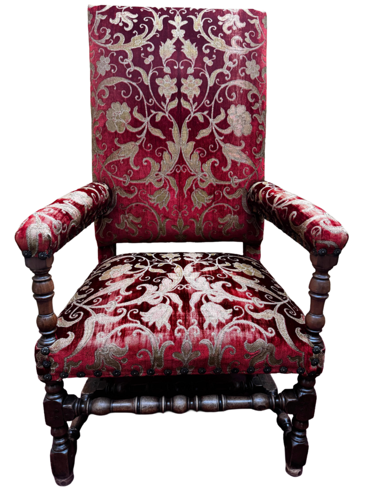 A Pair of 17th century Louis XIII style walnut framed open arm chairs, circa 1680. High rectangular upholstered back panel, upholstered arm rests and tight seat, in burgundy and gold cut velvet trailing floral design fabric, with rose-head nail trim. The arm supports, front legs and front and side stretchers are turned; rear legs are splayed.