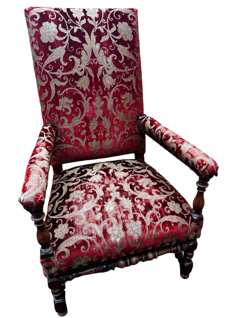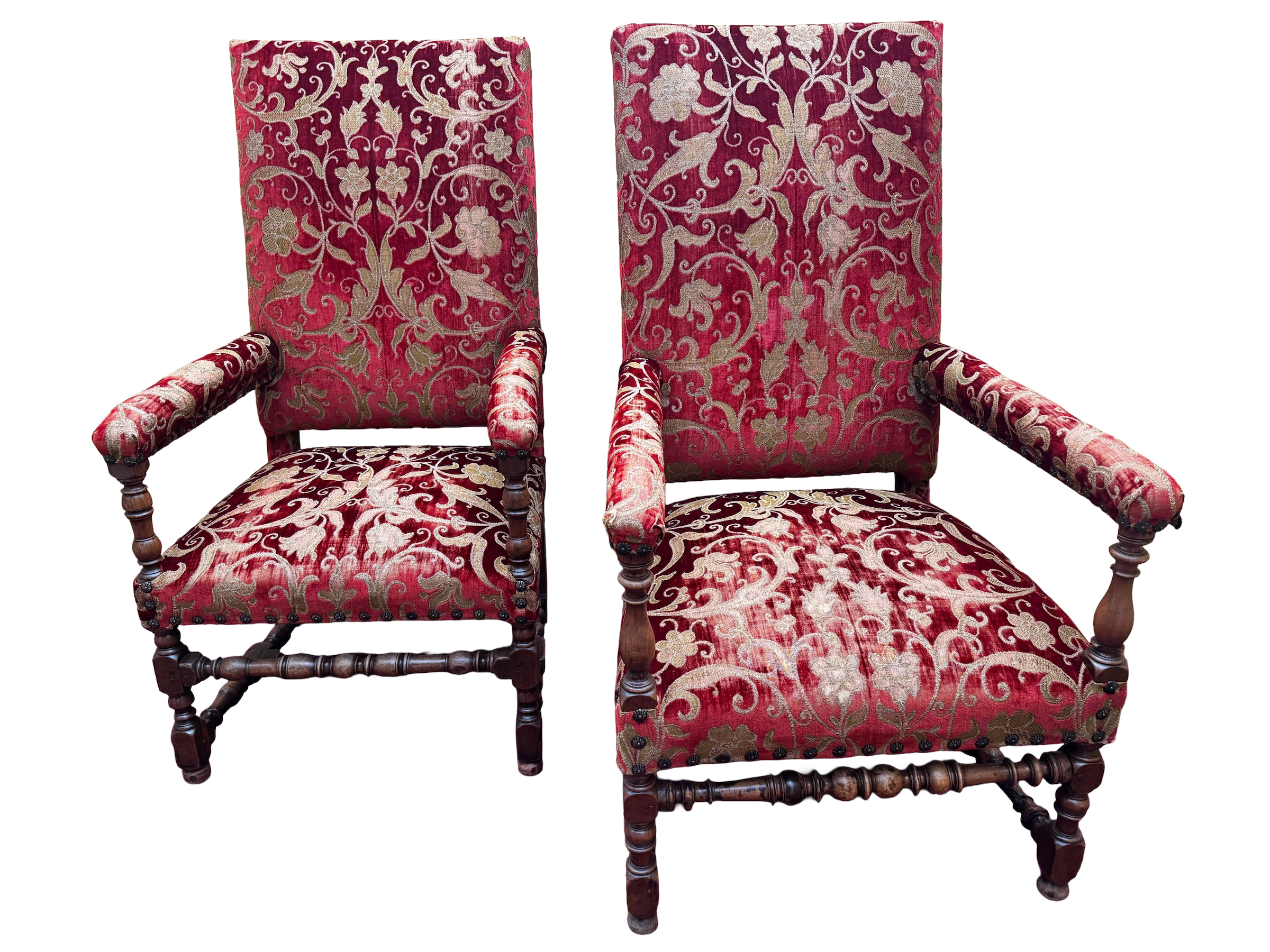 A Pair of 17th century Louis XIII style walnut framed open arm chairs, circa 1680. High rectangular upholstered back panel, upholstered arm rests and tight seat, in burgundy and gold cut velvet trailing floral design fabric, with rose-head nail trim. The arm supports, front legs and front and side stretchers are turned; rear legs are splayed.